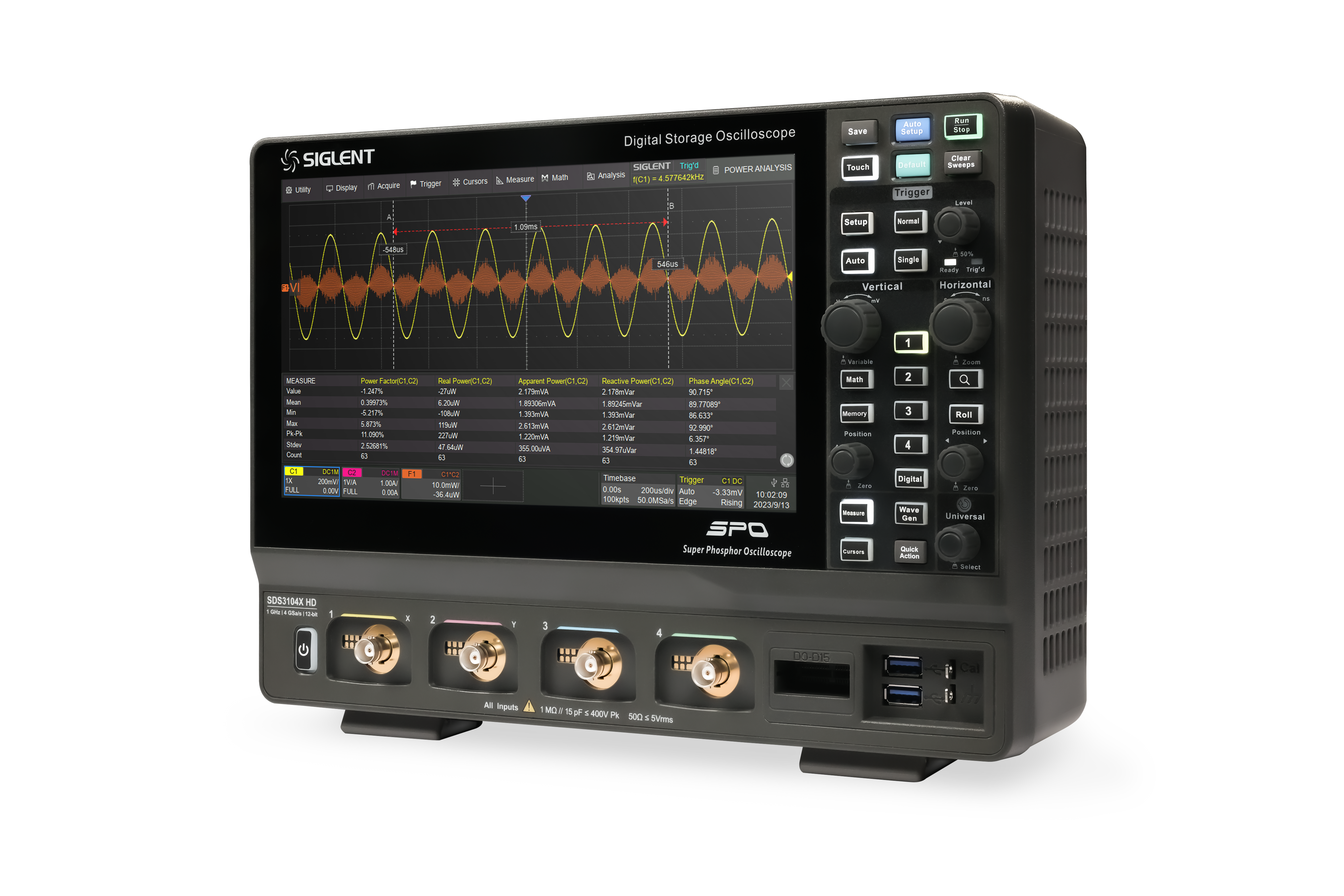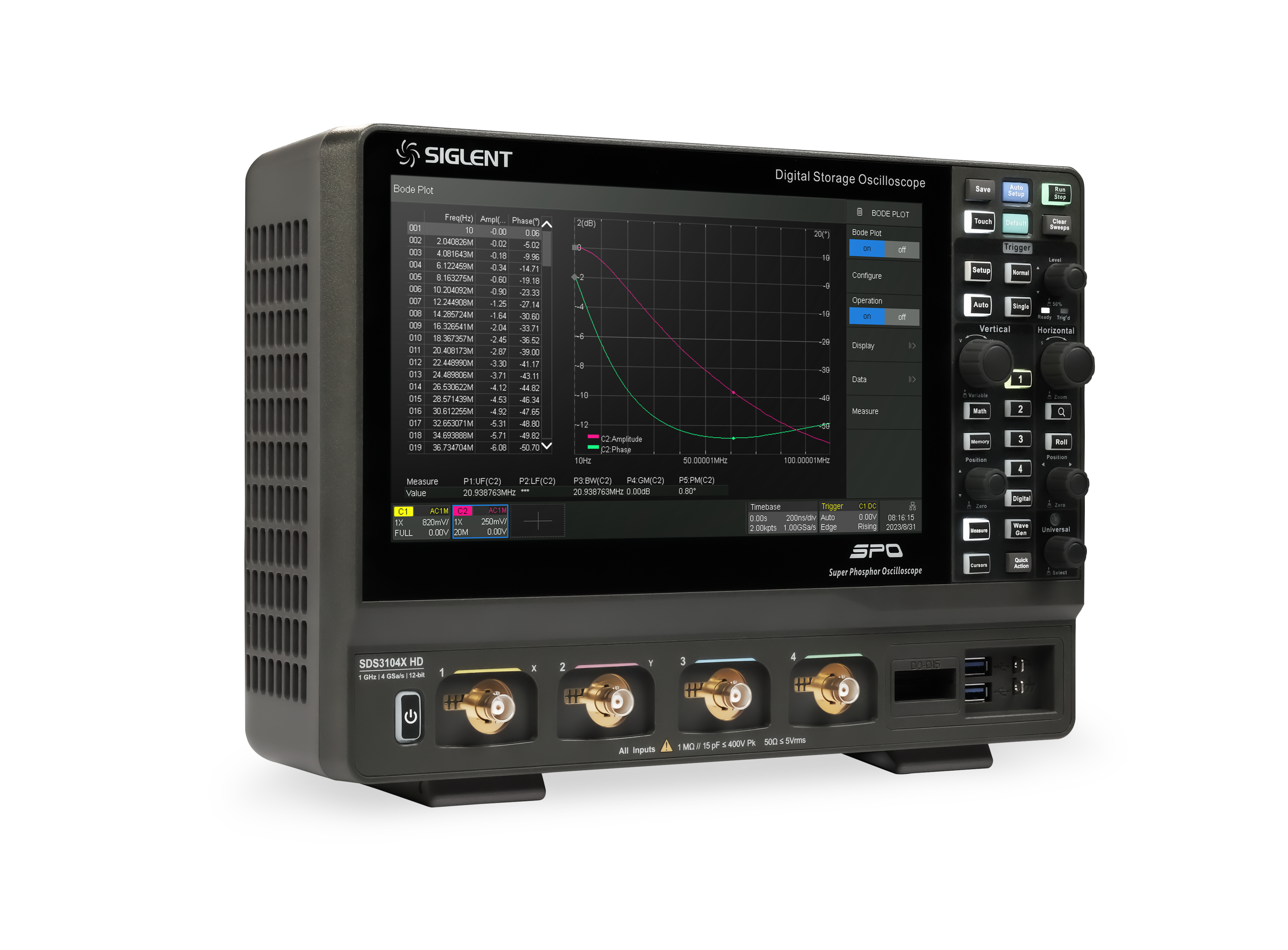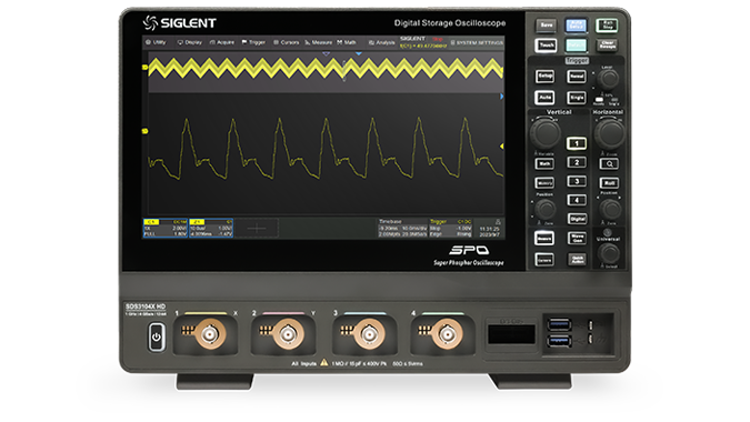 SIGLENT’s SDS3000X HD series Digital Storage Oscilloscopes are available in bandwidths of 1 GHz, 500 MHz and 350 MHz, have 12-bit ADCs with sample rate up to 4GSa/s, maximum record length of 400 Mpts/ch, and display up to 4 analog channels + 16 digital channels for high performance mixed signal analysis.