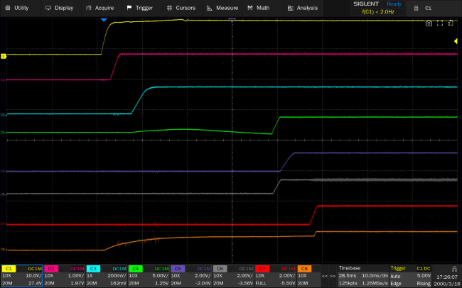Modern electronic systems incorporate various chips and modules whose initialization and operation may interfere with each other. Power-up sequence testing ensures that signals from different circuit modules follow the correct timing to avoid conflicts and guarantee system stability. For example, improper power-up sequences in communication systems can lead to data transmission errors. As circuit complexity increases, so do the challenges of power-up testing. The SDS5000X HD captures the entire power-up process of all relevant signals in a single acquisition, reducing measurement time, improving efficiency, and minimizing errors caused by repeated tests. For complex circuits with 8 power rails, this capability enables one-shot measurements.