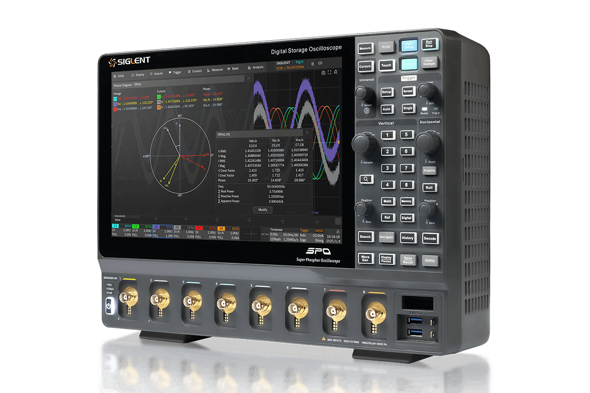 Using an 8-channel oscilloscope for three-phase power analysis allows simultaneous connection to all phases. It synchronously measures three-phase voltage and current signals, accurately capturing waveforms and parameters in real time. Users can directly observe and compare phase relationships to ensure balance. With the Fast Fourier Transform (FFT) function, multi-channel oscilloscopes perform harmonic analysis on three-phase signals. Optional three-phase analysis software supports vector diagram testing for motors, power quality assessment, ripple analysis, and efficiency evaluation.