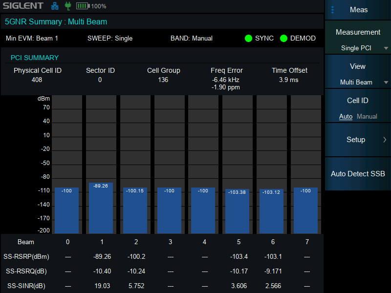 During 5G base station deployment, operators require precise validation of network quality and beam performance. The SHA860A’s 5G NR OTA mode demodulates signals to extract key parameters, including frequency, physical cell identity (PCI), SSB index, frequency error, and error vector magnitude (EVM) for the SSB portion, visualized via constellation diagrams. This functionality is vital for optimizing 5G Non-Standalone (NSA) deployments, ensuring seamless coordination between LTE and 5G networks.
