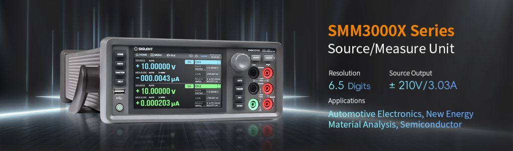 February 27, 2026 — SIGLENT Technologies releases SMM3000X Series Source/Measure Unit (SMU). SMM3000X features 6½-digit resolution, output capability of up to ±210 V DC voltage, ±3.03 A DC current, and ±10.5 A pulsed current, with programming and measurement resolution down to 10 fA / 100 nV, and a maximum acquisition rate of 100,000 points/s.