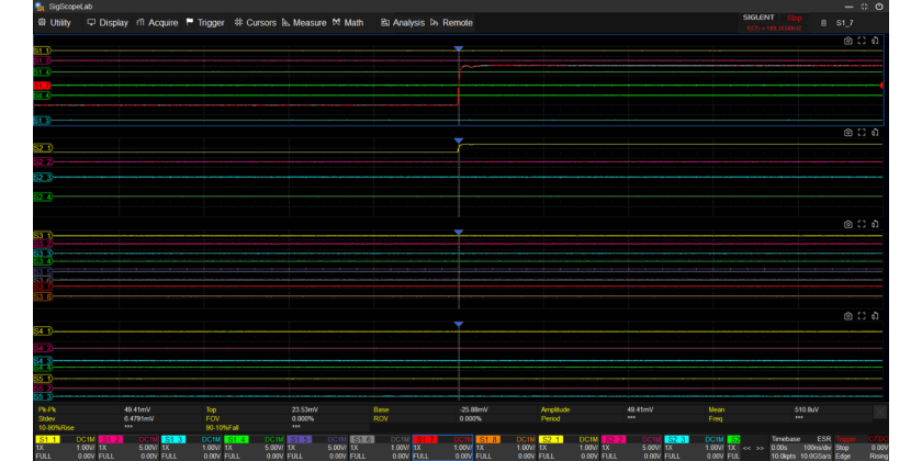 SigScopeLab software, which is a professional time-domain signal analysis and oscilloscope control software running on the Windows operating system: it provides a similar user-interactive interface as SDS advanced oscilloscopes, which is perfect for avoiding the discomfort of being detached from the physical equipment; a variety of multi-window display modes can be selected, and the horizontal time base of each memory waveform can be adjusted individually, so that the details of multiple waveforms can be observed more clearly. It is not only capable of controlling the oscilloscope acquisition on-line and obtaining waveform data for analysis on PC, but also realize the offline analysis of the waveform data on the PC., effectively speeding up the analysis speed and improving test repeatability and reliability for engineers.