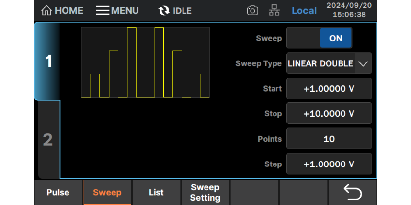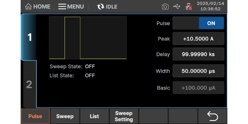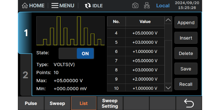 List Mode allows users to define custom output sequences with a minimum interval of 10 μs. Parameter transitions can follow linear, non-linear, arbitrary, or fully user-specified patterns. The instrument sequentially outputs the programmed voltage or current values while simultaneously measuring and recording data—ideal for irregular transient tests and multi-segment stress profiling.