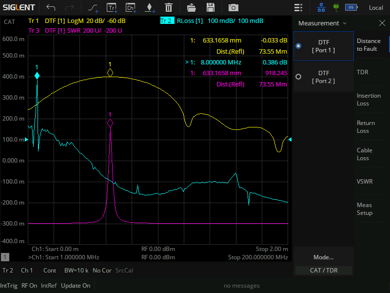 The CAT mode of the SHN900A verifies and troubleshoots the electrical performance of RF and microwave transmission systems, and is ideal for tasks such as installation and maintenance of antenna systems, distance-to-fault (DTF) measurements on cables, single-port cable loss measurements, and antenna matching measurements.