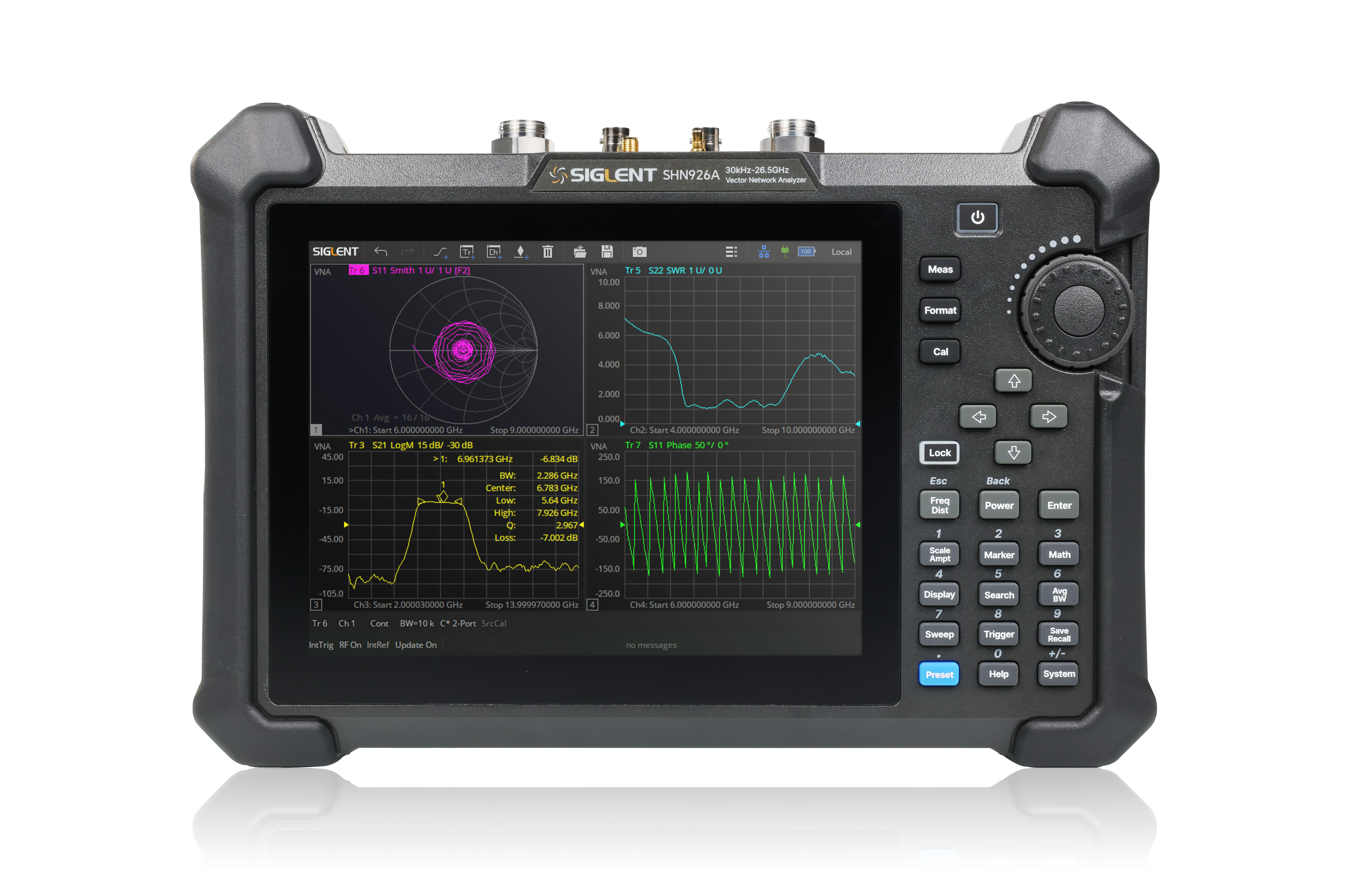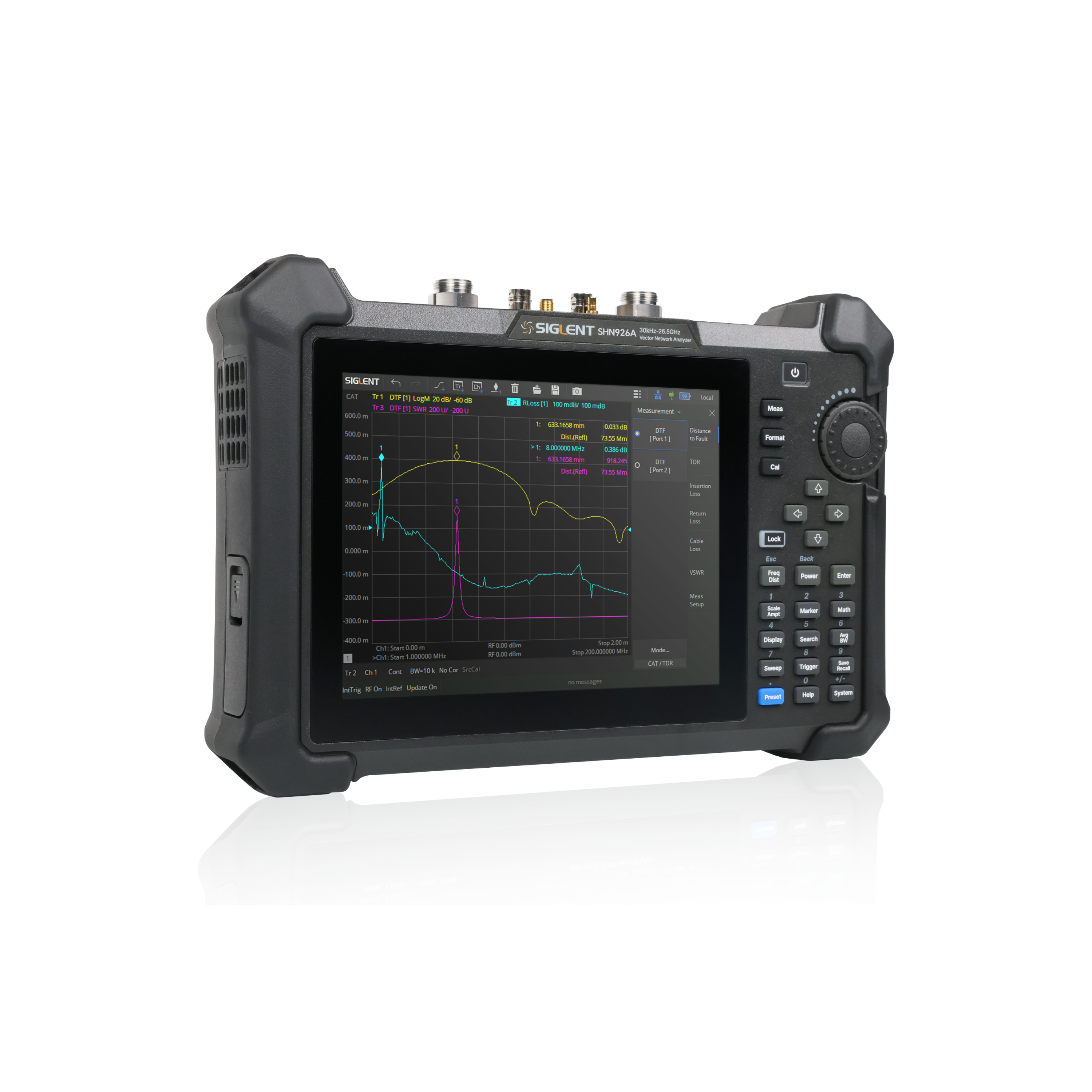 SHN900A series portable vector network analyzer with frequency range up to 26.5GHz, integrates vector network analysis, time domain analysis, spectrum analysis, and standard cable and antenna analysis. It is specially designed for portable and flexible testing of RF components, cables, and systems in R&D, production, maintenance and communications, antenna base stations, and automotive electronics.